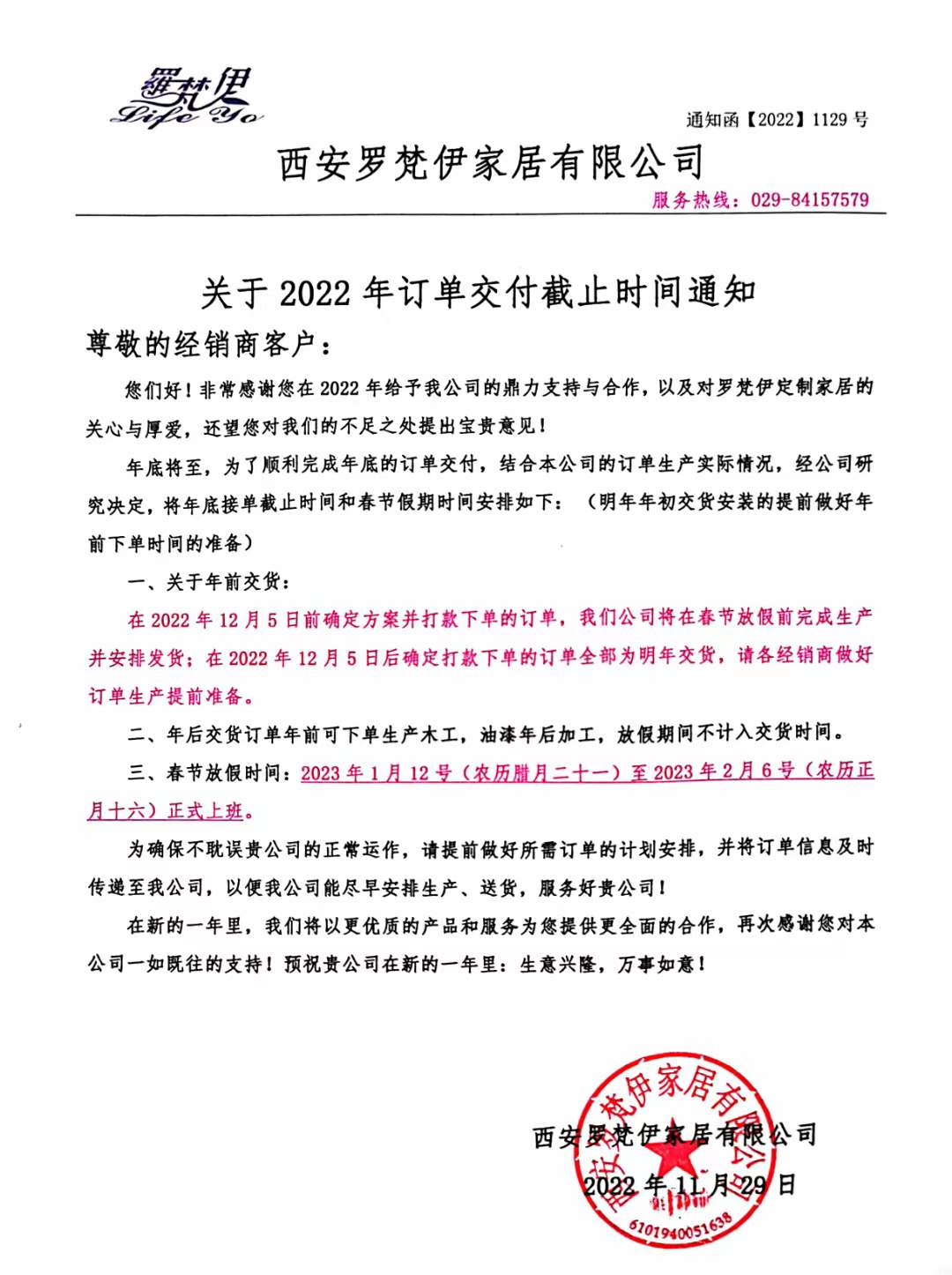 关于2022年订单交付截止时间通知: 非常感谢您在2022年给予我公司的鼎力支持与合作,以及对罗梵伊定制家居的关心与厚爱,还望您对我们的不足之处提出宝贵意见! 2023年,我们将以更优质的产品和服务为您提供更全面的合作,再次感谢您对本公司一如既往的支持!顺祝贵公司在新的一年里:生意兴隆...