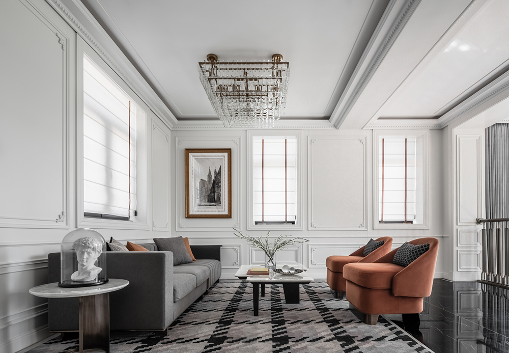 本案在配色上低调内敛,营造出典雅大气的气氛。但在空间细节上透露着高贵奢华的贵族气息,利索的线条搭配精致的软装,仿佛宫殿一般。 客厅以暖灰色为主基调,金属作为配饰,营造出法式浪漫。华丽的金属吊灯与朴实的黑色木茶几相对比,脏橘色的绒布沙发搭配白色毛绒地毯,细腻的...